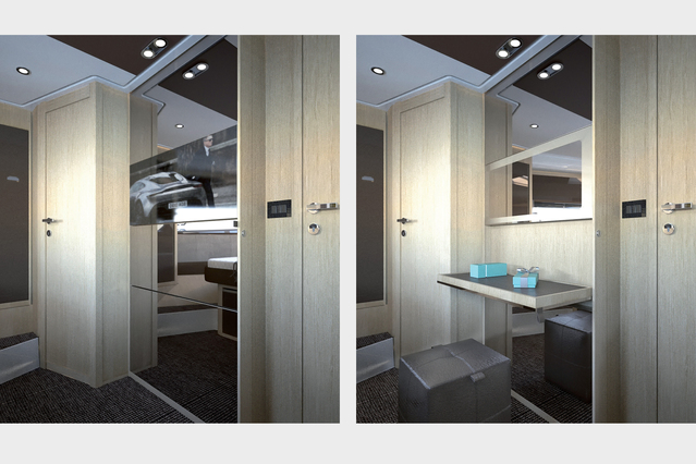 Δύο καμπίνες βρίσκονται στο κέντρο. Στη δεξιά πλευρά, η καμπίνα VIP διαθέτει διπλά συρόμενα κρεβάτια τα οποία μπορούν να μετατραπούν σε βασιλικό μέγεθος, και μία τρίτη καμπίνα επισκεπτών με μεγάλες κουκέτες και άπλετο φυσικό φως, χάρη στο ευρύ μεγάλο πανοραμικό παράθυρο.