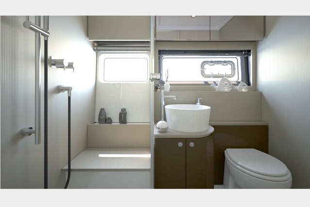 Δύο μπάνια, ένα μέσα στην σουίτα και ένα για την καμπίνα επισκεπτών, είναι εξοπλισμένα με καμπίνα ντους για μέγιστη άνεση.