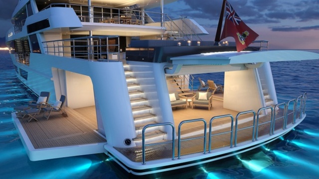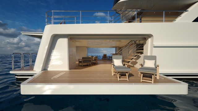 Two side doors serve to launch the tender and toys and double as terraces. Additional storage for Jet Skis, Seabobs and diving equipment is located beneath the sunpads on the foredeck.