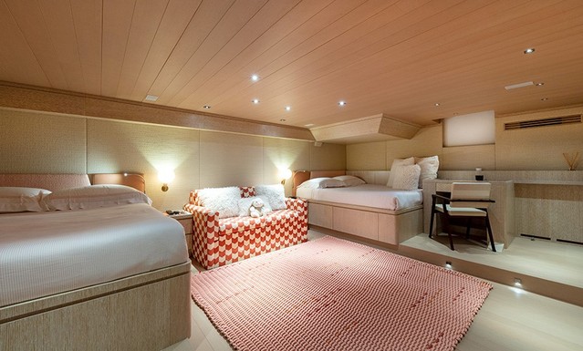 On the lower deck, the old twin cabins were replaced with two new ensuite cabins: the owner’s suite, which has four hull windows for extra light, a separate dressing room and marble-lined bathroom, and a double cabin for his daughter with two new windows.