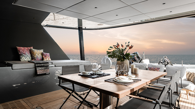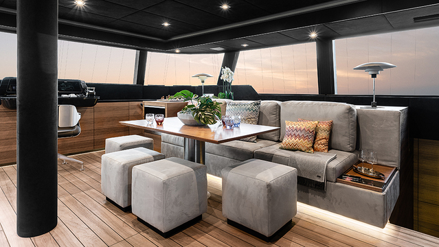 Designed in partnership with Polish vessel builder Sunreef Yachts, the one-of-a-kind catamaran is essentially a Sunreef 60 that has been fitted with a high-powered electric propulsion system—two 55 kWh engines generate electricity from wind and charge the 140 kWh propulsion battery—as well as curved solar panels which provide clean energy to sustain all of the yacht’s needs. This cutting-edge setup allows E to cruise for up to 6 hours, silently, free from noisy—and polluting—diesel engines. (Of course, there is a 90 kW diesel generator onboard if things get hairy.)