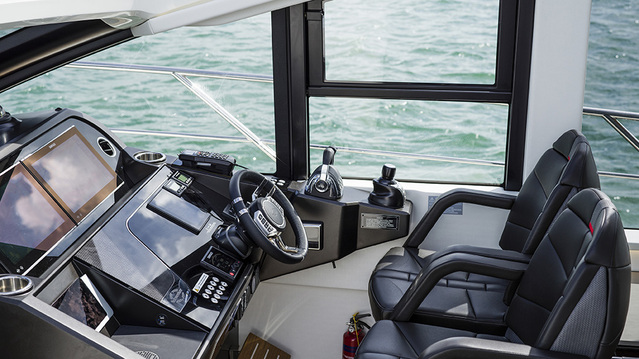 We were also protected in what felt like a giant bubble under a hardtop that is defined by large overhead glass panels. Sunseeker designed the carbon-fiber top with glass for protection in wind, but without sacrificing natural light. The 30-plus-gusts and whitecaps outside felt like watching a movie. The new Sunseeker also has new Simrad evo3 touchscreen displays that allow the driver to control onboard functions without having to locate buttons or switches. Ditto the monitoring of fuel, batteries, generator, engine status, and other systems. The Simrad screens also integrate navigation like GPS, autopilot and radar so it’s essentially a one-stop shop for running the boat.