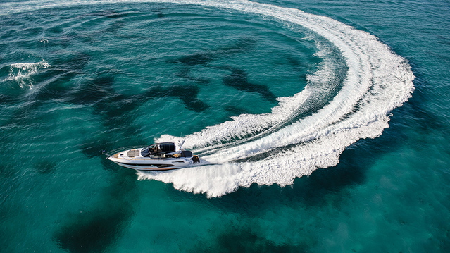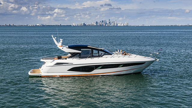 I ran the 60 Evo for a few hours on South Florida’s Intracoastal Waterway, heading out into the Atlantic into four- to five-foot seas. The yacht reaches a top end of 34 knots, reasonably fast, but the best feature is the Hydro-Pack hull design, which increases water flow through the props for a smoother, more efficient ride. Just off the Florida coast, the Sunseeker didn’t shoulder its way through seas but rode up and over without the hull vibrations typically found other boats. Considering the sea state, it was a smooth ride.