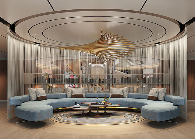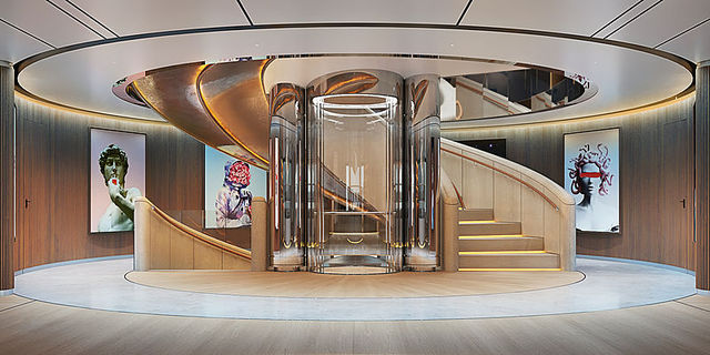 Stormbreaker intends to redefine the boundaries of technological innovation with a fully integrated and interactive audio-visual experience by Icon Connect, which will be able to record and broadcast live footage from the outdoor surroundings. Another key feature, the complex glass atrium, is located at the heart of the ship.