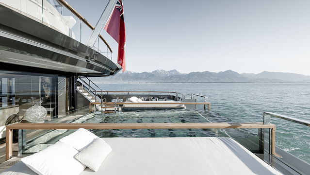 A well-positioned double staircase links the aft cockpit with the beach club below to ensure that seafarers can split their time between the areas. The main deck features an expansive pool and alfresco dining area, with an open-fire barbecue, the perfect trio for those who want to socialize. The beach club, meanwhile, is all about relaxation. It boasts a sauna, hammam, massage room and gym, not to mention generous open space, thanks to foldout sides and the large swim platform at the transom.