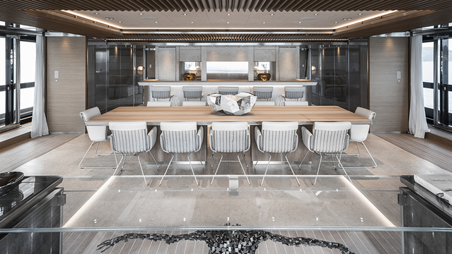 The yacht sleeps 12 people across four guest rooms, full-beam VIP suite and the owner’s suite which comes with its own whirlpool bath on the adjoining deck. Of course, guests will have full access to the five-star amenities, including the helipad—which doubles as a solarium—two tenders, a 500-room wine cellar and a multimedia room.