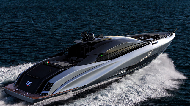 Just like her wheeled muse, the 88-foot yacht packs an excessive amount of power. She’s fitted with twin 2,600-hp MTU 16V 2000 M94 diesel engines, which can reach more than 40 knots at full tilt. And when cruising at 35 knots, the vessel offers a 350-mile range.