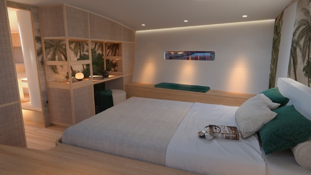 Baltic has been thorough about building sustainability into the Café Racer. All decking is made from Lignia Yacht’s eco-friendly, durable pine instead of traditional teak, and more than 50 percent of the yacht’s hull structure is reinforced using Bcomp ampliTex flax, a naturally grown flax. This provides excellent soundproofing and saves space, compared to traditional insulation. Light oak timbers, flax composites, wicker and paper cord also feature in the interior.
