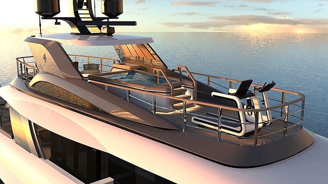 Complete with a fully-stocked toy store that includes three jet skis, an inflatable jet ski dock, a waterslide, a climbing wall, clear-bottomed kayaks and diving gear, Geco is to be powered by twin CAT C32 engines, allowing her to reach up to 18 knots.
