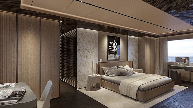 Inside Geco, her custom interior design covers her six staterooms - including a full-beam master and VIP staterooms - in a style that the owner requested to be “a very social and relaxed environment” that is said to be a mix of contemporary Italian with a French allure. Materials such as French wood, Italian marble, bronzed metal and leather are used for detailing throughout the new superyacht to contrast against tones of navy blue and cognac orange.