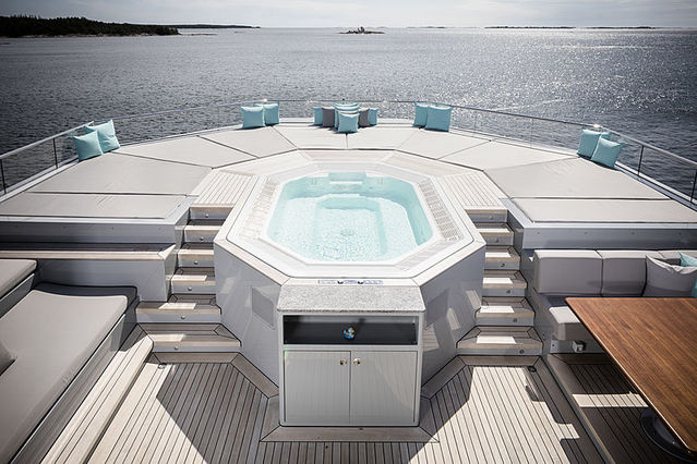 Looking out onto the helideck is the gym deck, fully-equipped with whirlpool with dining area to starboard, sun pads forward and a U-shaped seating which can be converted into an outdoor cinema space. Through the glass doors is the gym with its sauna, shower, bathroom and service pantry. Accessed via the in-built elevator, the bridge deck houses the pilothouse, the captain’s quarters and one of the six double guest staterooms. From midships aft, the bridge deck is a large open-plan living area surrounded by the overhanging glass conservatory.
