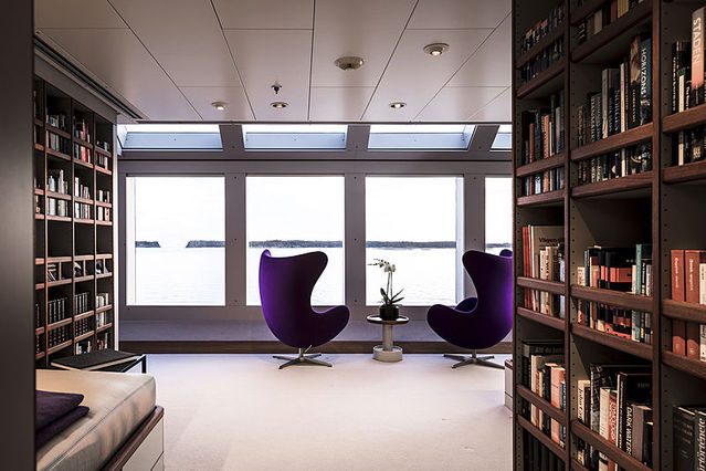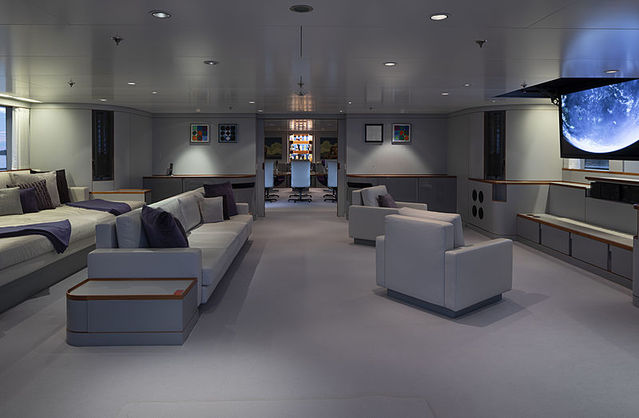 The combination of reflective construction materials such as steel, aluminium and glass help create her distinctive grey colour and angular windows that famously jut out from her superstructure. As per the owner's wishes, the cleverly-created windows create her bridge-deck conservatory to purposefully draw in light.