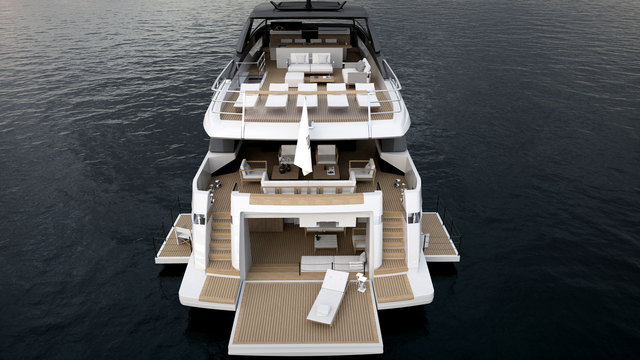 The starboard side deck has been eliminated, making way for a large dining room with full height windows. The sole side deck sits on the port side of the main deck and leads to the large sunbathing area on the foredeck. Owners have the option to replace a C-shaped sofa facing the deckhouse with a Jacuzzi.