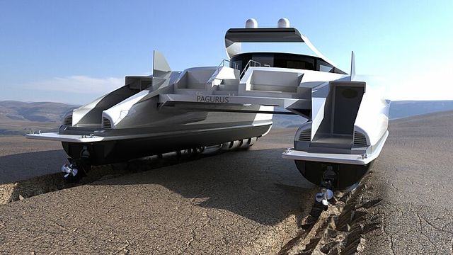 Normal sailing propulsion happens on the new yacht concept via dual propellers stern drive coupled with twin 890hp diesel engines capable of moving the Pagurus to an estimated top speed of 24 knots. When the Pagurus reaches land it can increase its draft by lowering down the rotating cylinders to transform the catamaran into an amphibious vehicle, able to move on sand or mud terrains to speeds of up to 30kmh.