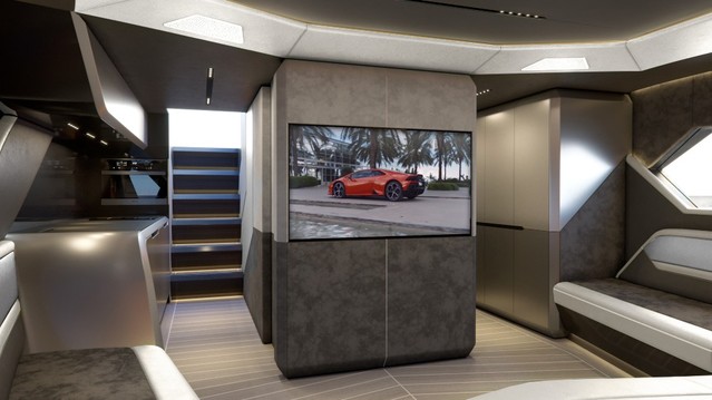 A trademark Lamborghini motif is the distinctive hexagonal shape of its supercars when viewed from the front or rear. This has been subtly reproduced in the angled hull windows and open transom of the yacht.