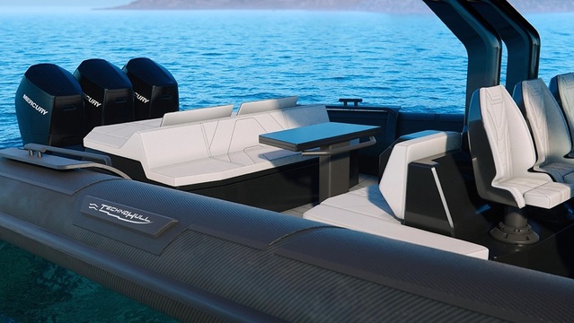 The newcomer cuts a sleek, aerodynamic silhouette with sharp, aggressive lines and a semi-straight bow. As always, Technohull’s signature Dynastream hull with its deep-V shape and ventilated steps will pierce waves and deflect spray. This ensures high speeds, maximum efficiency, exceptional seakeeping and top-notch handling even in rough conditions.