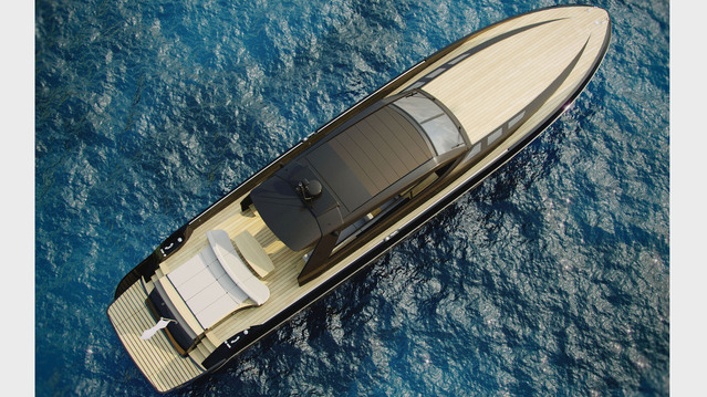 Dirand also gave the exterior plenty of open lounging space, both fore and aft, and a broad open transom that leads down to the swim platform. The hard top has windows that extend along the sides but are not fully closed, so there is protection against the elements but also ventilation across the helm area. The area also as a bar and galley. Beautiful wooden planking gives the decks a classic look.