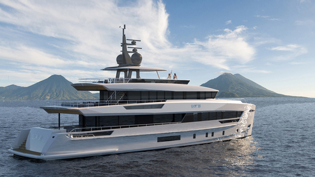 The superyacht has a modern profile with a plumb bow and full-height windows in both the skylounge and main saloon. Its abundant outdoor spaces put the fresco in alfresco. There are two exterior dining areas, one aft of the main deck and the second outside of the wheelhouse (a third indoor formal dining area is standard). An area up front is a great social space, with a large lounger and Jacuzzi. The beach club at the rear is designed to be multifunctional, equally useful for guests who want to step off the back into the sea, but with housing for the tender and water toys. The club includes a bathroom and dive center.