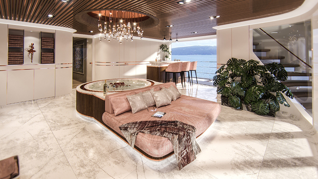 When it came to disruption, Vripack went even farther with Maharani, effectively turning yacht design on its head. The team disposed of the traditional layout of most yachts in this class, moving the galley, engine room, and wheelhouse so they could repurpose those areas for the benefit of the owners. The swimming pool went to the bow, and the beach club—with sauna and spa—was connected to the guest rooms, rather than being an isolated cubby hole at the stern. The designers also penned in 150 feet of open deck space from stem to stern on the main deck, effectively creating 10 social areas that offered guests privacy and access to the outdoors. Even more unusual for a yacht this size is the second deck devoted entirely to the owners, who can enjoy their private-terrace areas fore and aft, with a personal Jacuzzi, as well as the large interior spaces. The designers made sure there are beautiful views from nearly every part of the yacht.