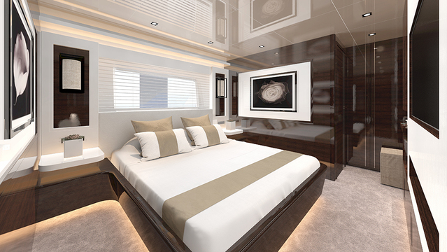 London-based interior designer, product creator, author, and TV and film personality Kelly Hoppendreamed up the contemporary interior, just as she did the Pearl 80 and the 65. Dark-wood walls and floors in the saloon are complemented by white pillows, a white glossy ceiling, and white-marble wall and white chairs and dining table for eight in the adjacent dining room. A standout feature in this area are the floor-to-ceiling sliding-glass doors that open on three sides of the saloon, bringing the views and fresh air in.