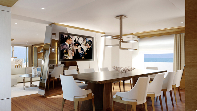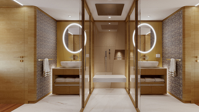 Team Baglietto used Italian walnut as the base wood, combining it with gold and bronze accents, light-toned carpet, and cream-colored leathers. To serve as a counterpoint to the darker joinery and tables, a light-colored Canaletto-nut-pattern wood floor was used in the saloon and staterooms. The paneling on the walls had irregular cuts of inlaid wood that gave it a modern feel, without detracting from its elegance. Floor-to-ceiling windows bathed the saloon and skylounge with natural light.