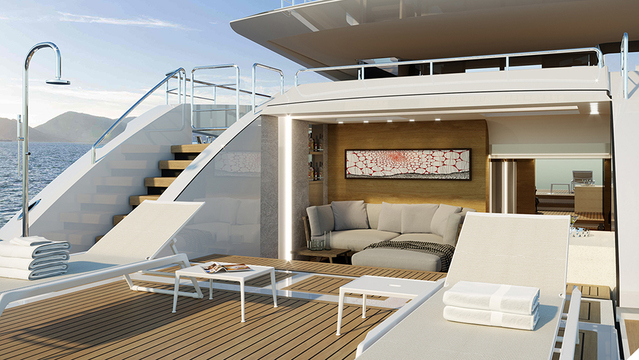 The beach club is also an unusually large for a yacht this size, with more than 500 square feet devoted to a steam room, bar, and an area that could be used as a gym, spa, or some sort of quiet retreat center. Owners and guests can sit in the beach club and look out over the open expanse of ocean behind the yacht.