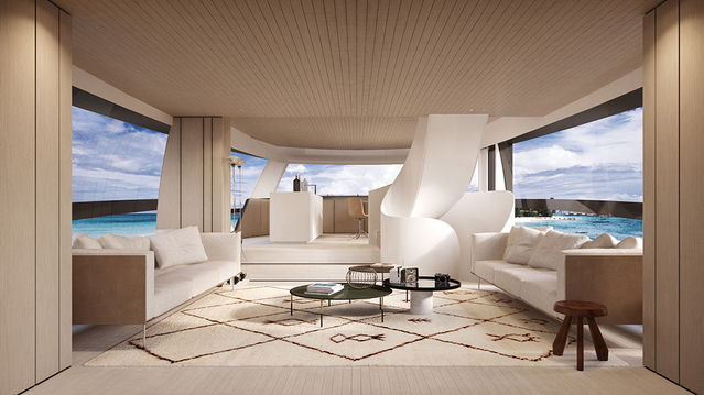 Featuring exterior lines and an interior layout by Studio Zuccon International Project, this first hull showcases a special-edition interior created by Italian designer Piero Lissoni, who is known for his modern furniture, architecture, and graphic design. The highlight of his sophisticated decor is the sculptural staircase that flows among three decks. Lissoni chose a neutral color scheme with loose—rather than the more usual fixed-yacht—furniture, creating a calming, warm, and welcoming ambience.