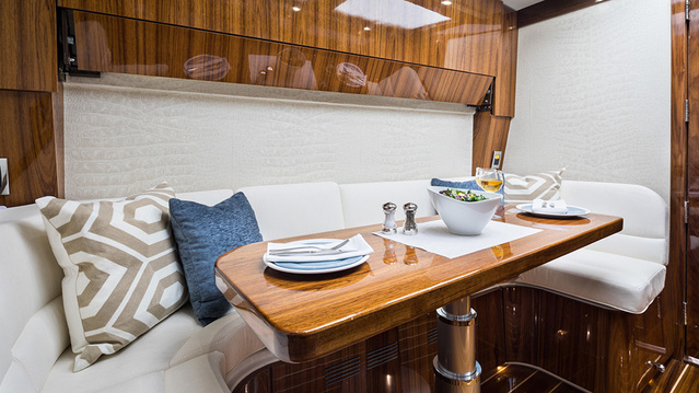 The real action can be found in the boat’s cockpit, where an owner could take 20 of his friends on an offshore fishing trip. The teak package on the first Estrella includes the decks, tables, coaming boards, and even the steering wheel. The teak dresses up the boat nicely. It also has features like a projection television in the cockpit, plush sofas, and a table for alfresco dining. The foredeck area has seats and a small table as well as a sloping sunbed for two.