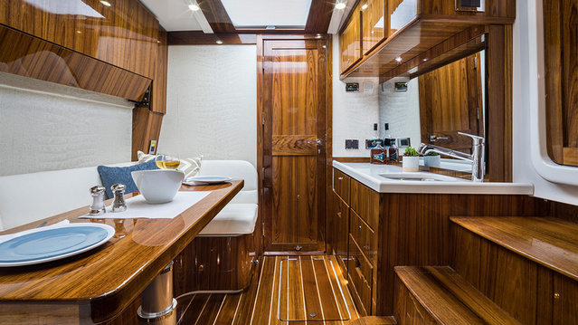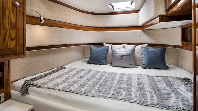 Estrella has a high-end, carbon-fiber layup and a large cabin with a master stateroom and custom-made Zebrano cabinetry. Besides the luxurious appointments, the interior is surprisingly spacious for this type of yacht. It turns into a nest for the owner and guests.