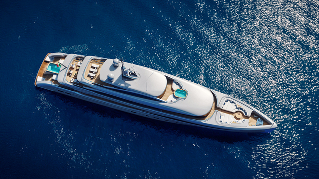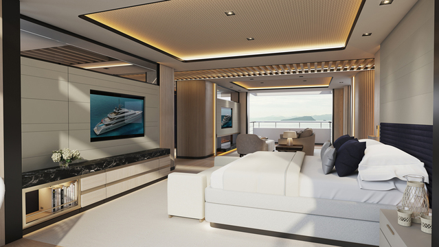 The coolest thing we’ve learned about the yacht from the renderings? At the stern, a long infinity pool extends out over the top of the yacht’s beach club, creating a space Benetti has dubbed the pool lounge.