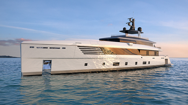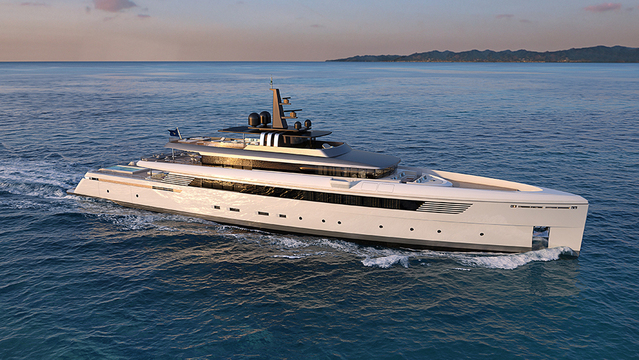 Zuccon International Project Studios, which designs many of the Ferretti line and custom superyachts, created the Heritage line. These blue-water yachts emphasize large exterior social spaces, with sleek, almost aggressive lines throughout the profile. The lines move aft toward the stern in a stylish confluence of beach club, staircase, and cockpit. The new line will include 180-foot, 213-foot, and 246-foot models.
