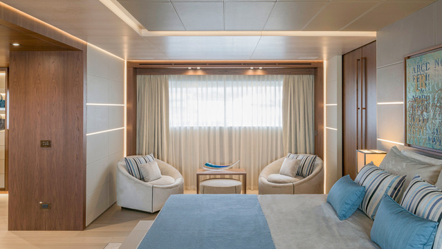 When they are not enjoying the 180-degree views over a glass of wine on their private balconies, the Ridingers (and up to 10 guests), will have plenty of space to lounge on the yacht’s decks. The main deck is likely to be the preferred hangout spot—it’s equipped with a glittering swimming pool, a sundeck, and sprawling outdoor lounge where guests can splash and spread out. A quick flight of stairs leads down to the beach club at the stern, which boasts 750 square feet that opens directly on sea level.