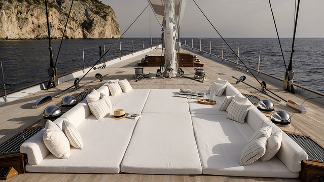 As experienced sailors, the owners wanted Aquarius to be able to perform well but with a simple-to-use sail management system. Royal Huisman, mast specialist Rondal, and a team of rig specialists from Doyle NZ created the carbon-fiber masts, rigging, and sail plans, with the maximum downwind sails measuring a mind-blowing 32,292 square feet. The team also used modern technology to simplify sailing handling, including remote units that raise and lower the massive sails.