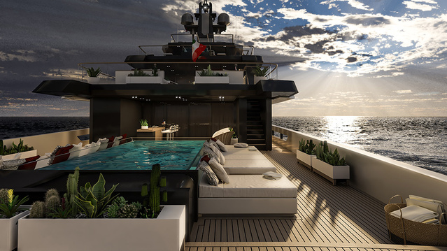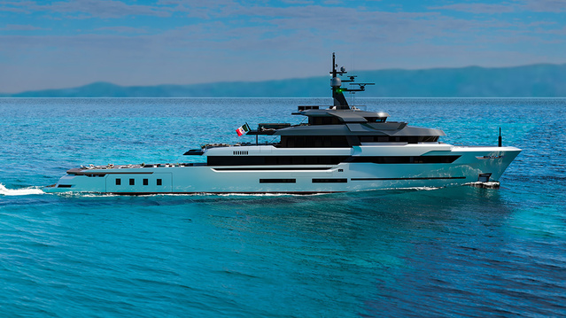 Hot Lab’s fresh take on the new 220-foot explorer yacht for Viareggio Superyachts (VSY) includes a tiered profile, a long, open stern, and a luxury interior. The Milan-based design studio borrowed the superstructure style from commercial and military vessels because it provides excellent visibility forward and frees up 150 feet of space in the stern.