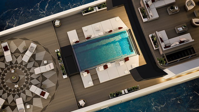 The tender garage houses three boats, two personal watercraft, and other water toys. The yacht is powered by twin 2,600 hp Caterpillar diesels, which will give the yacht a top-end speed of 17 knots. At 12 knots, it will have an estimated range of 5,000 nautical miles.