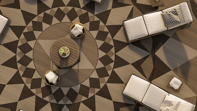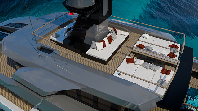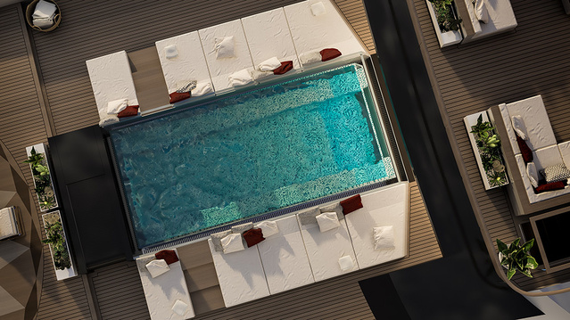 Instead of the usual deck for a helipad and tender storage, Hot Lab decided to put in a long swimming pool and patio with a cool diamond motif on the main deck—which, in fact, doubles as a helipad. In addition, the designers also did away with the usual stairs aft from the main deck to the swim platform. Instead, the yacht features stairs from the garage/beach club inside that lead up to main deck. An exterior social area on the upper deck in front of the wheelhouse provides a panoramic view of the water, and it sports a small infinity-edge pool. Owners and guests can enjoy the best—and private—views in the inviting upper-deck crow’s nest.