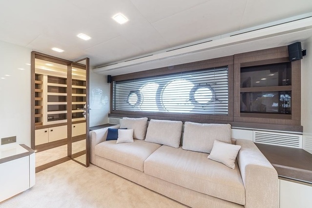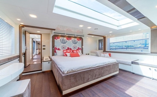 Likewise, the interiors impress with the same amount of space and with light coming through wide side windows and saloon balconies. Continuing this theme of space, the master cabin, situated on the main deck bow area, is bigger than most master suites found on larger yachts. Below deck, the guest cabins are generous in size and perfect for relaxation after an active day on the water. Large hull windows in all the guest cabins fill these spaces with an abundance of natural light.