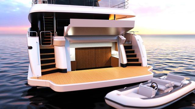 A large hydraulic swim platform will sit on the aft foredeck, while a transom garage will open to reveal a beach club. The swim platform will accommodate a five metre tender. A garage located behind the beach club will also fit a 5.5 metre tender.