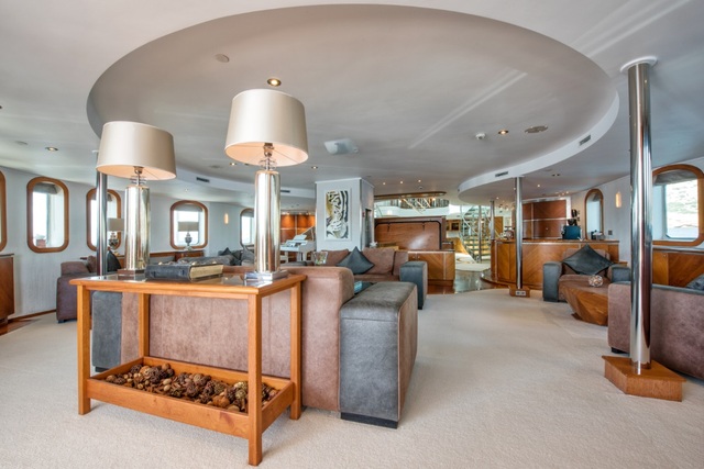 Sherakhan is a prime example of combining performance with exceptional onboard spaces. Her exterior is chic, cool and classic, with traditional aspects such as circular portholes for an old-world nautical touch. Interiors are equally impressive, with a cavernous atrium with overlooking mezzanine cast in wood, glass and chrome. Inviting suede armchairs, bespoke dark wood furniture and shelves lined with curiosities remind that she is an eccentric explorer vessel with a distinctive personality.