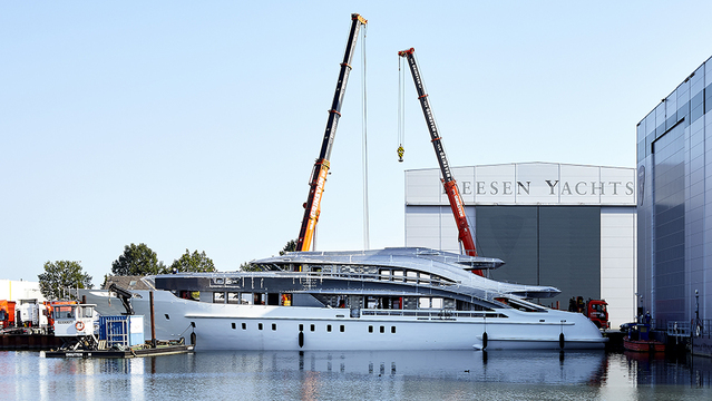The hull is floating in the water at Heesen’s shipyard in Oss, the Netherlands, while two large cranes lift the bare-aluminum superstructure from a barge and suspend it over the water. Other images in the series show how it is gently dropped inside the edges of the hull. The two sections will eventually be welded together. A Heesen spokesperson said the yard can join the two pieces either in the build shed or on the water. In fact, both options are standard procedure for most superyacht builders.