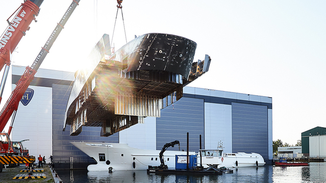 Most great shots of superyachts show them in their natural habitat of deep-blue waters moored off some tropical atoll, or perhaps in a picturesque European superyacht marina. So it is with some surprise that found ourselves completely captivated by a very different image released by Dutch yacht-builder Heesen—one that depicts the linking of a superstructure and its hull for the forthcoming 164-foot Project Triton.