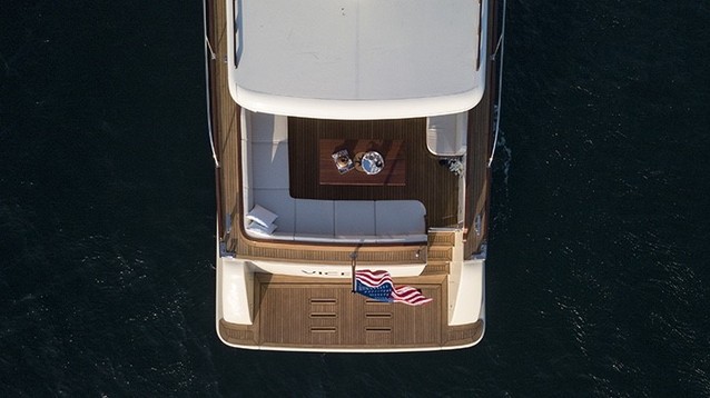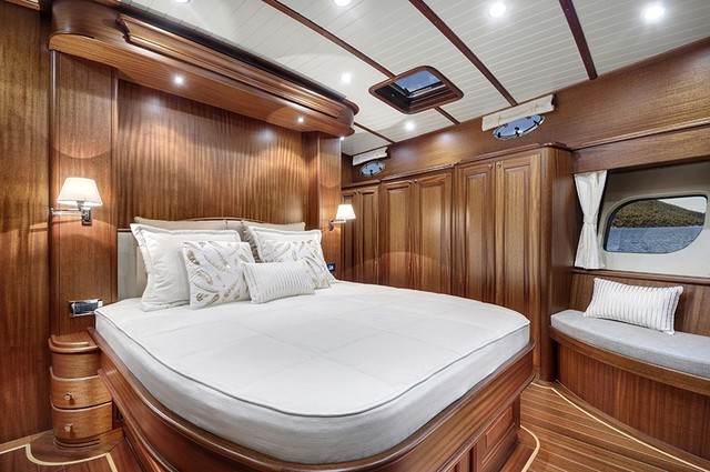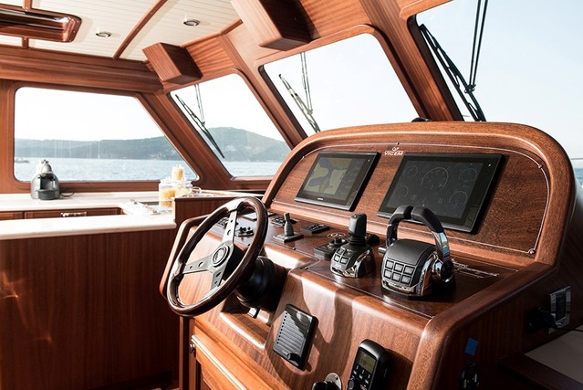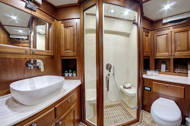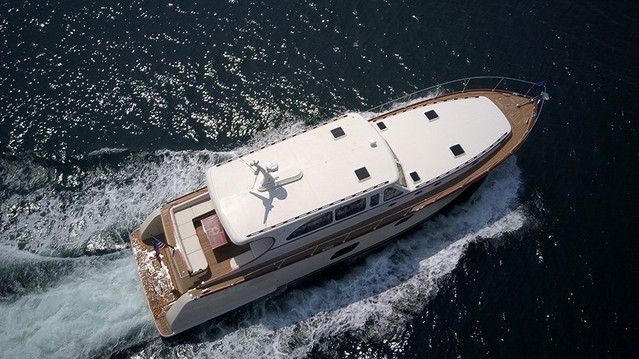 The exquisite wood work in the interiors is complimented by the latest in equipment and electronics, and a design that focuses on open spaces, storage aplenty and absolute comfort. Sinan Unal - Vicem's Chief Naval Architect and Marine Engineer - says: "Our fully custom construction process allows us to build a yacht that is not hampered by the constraints of a molded hull, therefore, it was our goal to build a 65 footer with the internal volume of a typical 75 to 80 ft express cruiser. Vicem has always offered increased living space compared to the competition, but we made it a point to go beyond even our own standards. One thing that invariably leads to discomfort on a boat is headroom. Even with a wide beam and lots of windows, if the ceiling is just a few inches above the head, people will start feeling claustrophobic very soon. On this yacht, we have 7 ft of headroom average throughout, with the course, with all that additional volume come more closets and storage everywhere. We challenged our engineers to achieve this unrivaled space without altering the classic proportions of our exterior, so this yacht's look is classic Vicem, sleek, elegant and uncluttered".