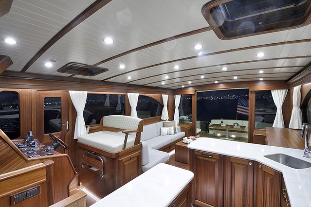 The cockpit of the 65 IPS Classic has a large L-shaped sofa and a wet bar. The salon has an oversize L-shaped sofa to starboard and a large lounge chair, flanking an entertainment center, to port. The galley is up and forward to port, with lots of counter space for long-range cruising. The helm station to starboard has seats for two.