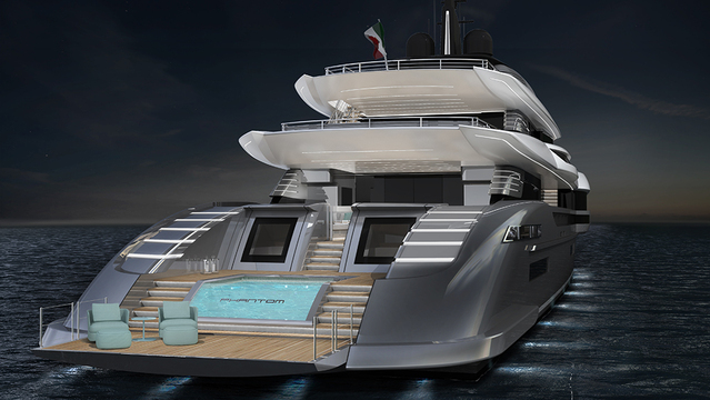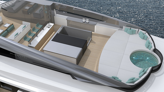 The Phantom will be built of aluminum. Powered by twin MTU 12V 4000 engines, the yacht will have an impressive top end of 20 knots, with a cruise speed of 18 knots. It has an extended range of 3,300 nautical miles.