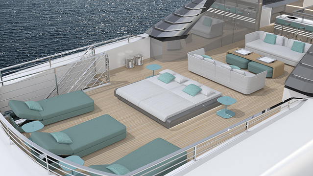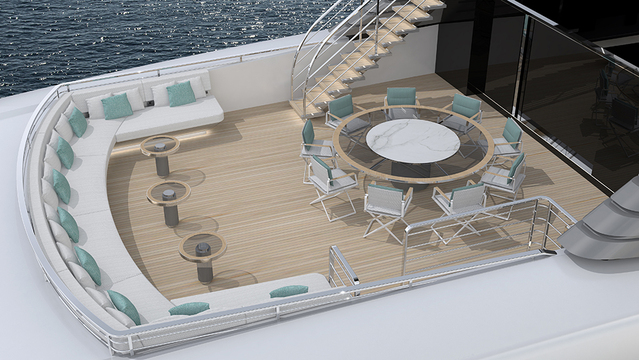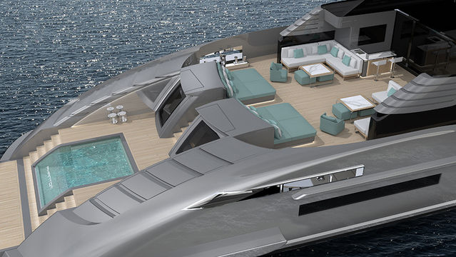 Team for Design’s aft section includes a beautiful and user-friendly beach club, with a swimming pool, twin doors leading into the yacht, and steps that lead down to the swim platform on the water. The cockpit above features an open social area, with twin sunbeds, lounges, and an outdoor bar. “This terrace facing the sea and beach club are positioned so close to each other that they offer the owners and guests dynamic daily use,” says Rossi.