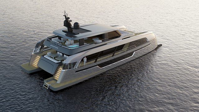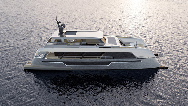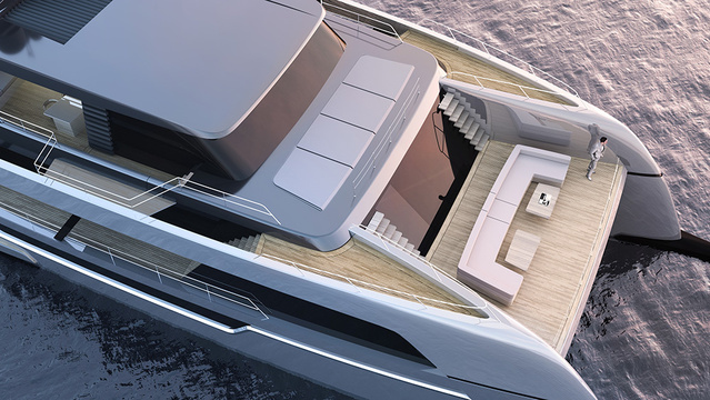 Sunreef will offer different layouts, the first being accommodations for eight guests and eight crew. The crew quarters are in the port hull, providing a division from the guests, who are located on the starboard side of the yacht. The owner’s suite is on the main deck, forward of the main saloon, offering exceptional privacy. The captain’s quarters are on the flybridge level next to the helm station. The 120 Sunreef Power has a large garage that holds the tender, Jet Ski, and a selection of water toys.