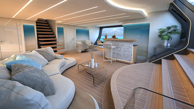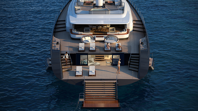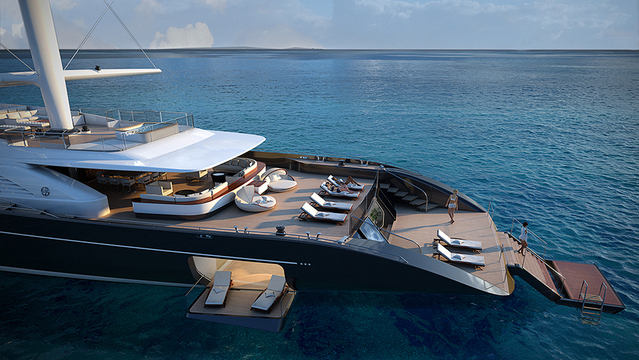 In the case of the 72-meter (236-foot) version, the platform is much wider, which means it keels over less, has more volume, and allows for more spacious owner accommodation. The wider hull and transom provide a layout more commonly seen on large motor yachts, with a beach platform, open side hull, and an inside-outside theme. The increase in power means more velocity, so the Falcon Rigs can be pushed to their limits, while the design itself means guests can walk around and enjoy the boat in safety.