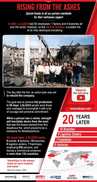 In 2000, LALIZAS had 50 employees, 1 factory and 4 branches all over the world, when a disastrous fire broke out at our premises and destroyed everything.