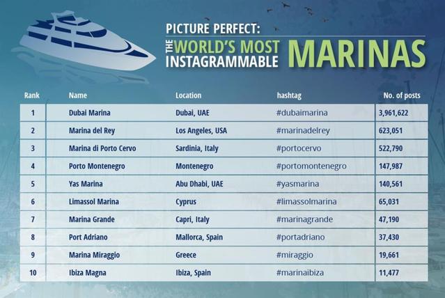 Όπως προαναφέραμε, την πρώτη θέση παίρνει η Μαρίνα του Ντουμπάι. Γνωστό ως ένα γραφικό σημείο με ουρανοξύστες, γαλάζια νερά και υπέροχα εστιατόρια, δεν αποτελεί έκπληξη το γεγονός ότι η #dubaimarina έχει πάνω από 3,9 εκατομμύρια δημοσιεύσεις στο Instagram. Στη δεύτερη θέση είναι η Marina Del Rey, μια παραθαλάσσια κοινότητα στο Λος Άντζελες με το λιμάνι να είναι το μεγαλύτερο τεχνητό λιμάνι της Βόρειας Αμερικής. Τρίτη στη θέση βρίσκεται η Marina di Porto Cervo στη Σαρδηνία, Ιταλία. Διάσημη για τα πολυτελή πάρτι και τη νυχτερινή ζωή, η γύρω περιοχή διαθέτει ένα μείγμα παρθένας φυσικής ομορφιάς και σύγχρονες εγκαταστάσεις, όπως μπουτίκ και κλαμπ υψηλών προδιαγραφών.