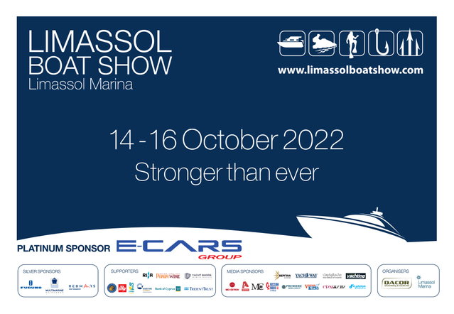 The Limassol Boat show has a strong team of sponsors and supporters such as E - Cars Cyprus, Furuno Cyprus, Multimarine Shipyards, REDMARS, Limassol Municipality, Ministry of Tourism, Bank of Cyprus, Trident Trust, Rina, Yacht Shore, Punin Wine, Ministry of Shipping, Illy and of course the media sponsors: Alpha Cyprus, Premier Media Group, Moi Ostrov, Russian Wave Group, The World Of Yachts, Russian Lifestyle Magazine, Vestnik Kipra, Yacht Way, MC digital media group, Cyprus Yachting, Fishing and its secrets.
